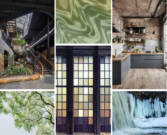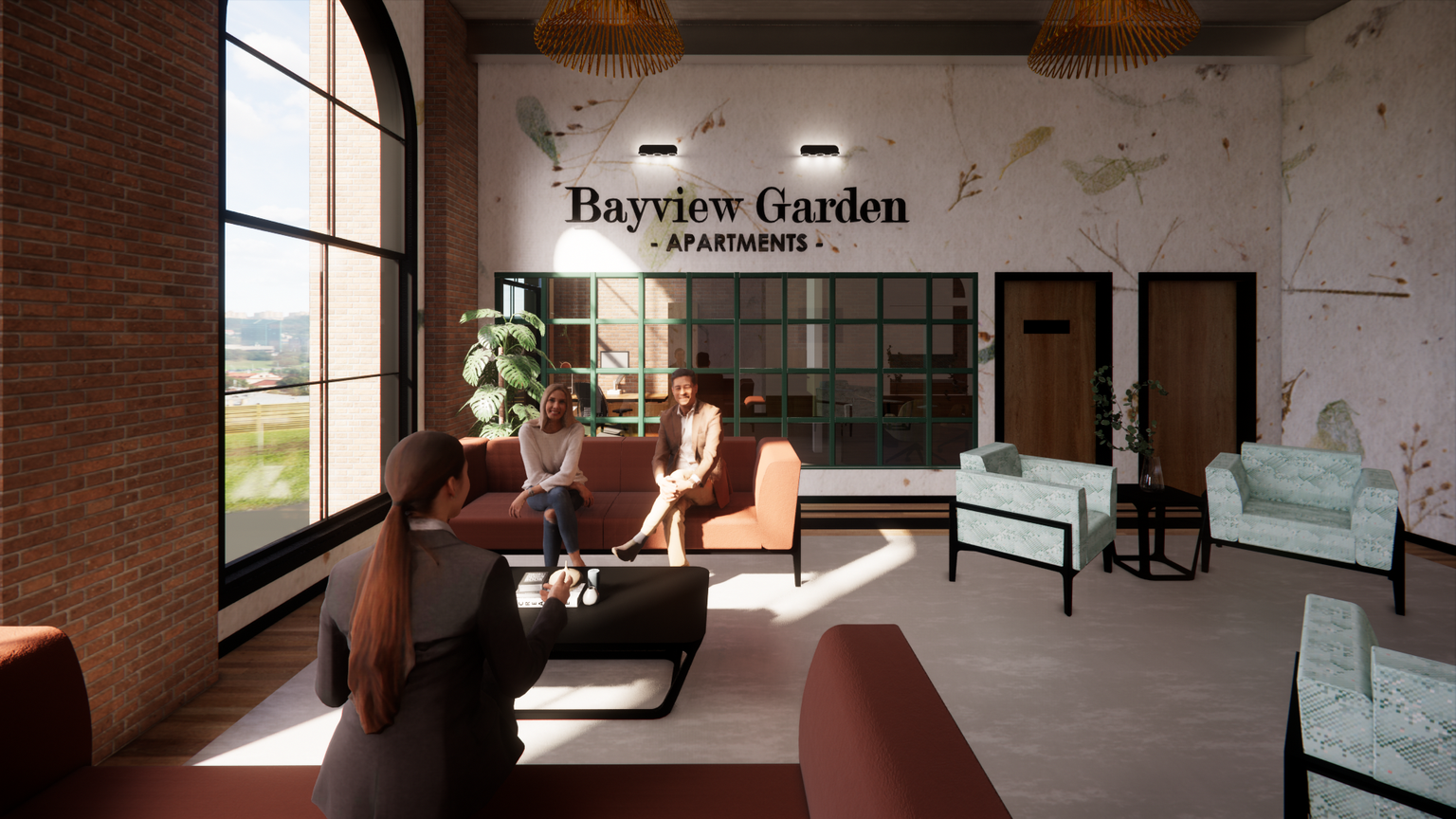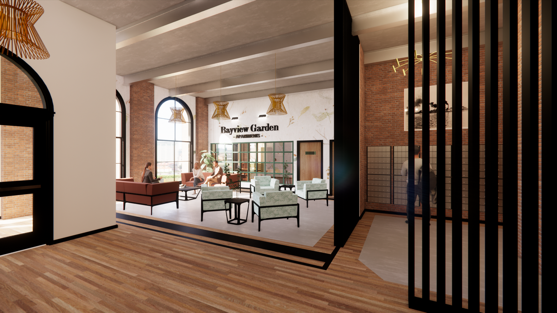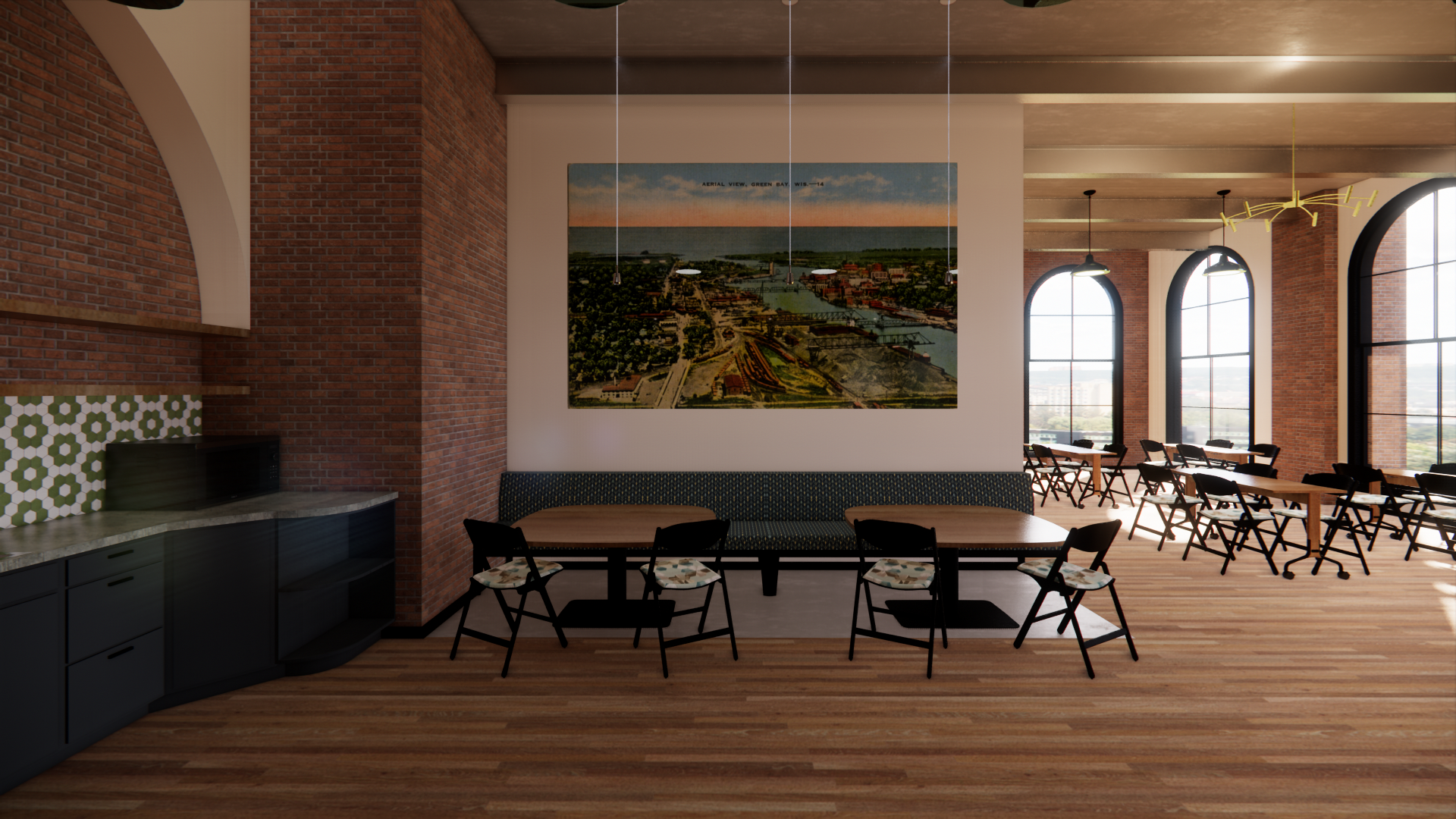 The concept of this Bayview Gardens is to put a spotlight on Green Bay’s industrial and manufacturing heritage. The apartment will feature a neutral color palette with subtle pops of color that pay homage to the city’s location and sports history. The combination of warm walnut textures and cool black metal accents provides residents with a sense of home. Colorful tiles in the kitchens and bathrooms will create a welcoming juxtaposition against brick walls that allow for decorative flexibility. Furniture in the community spaces will consist of clean lines and neutral leather fabrics to create a timeless feel and provide a sense of community amongst the residents. Bright gold accents will add a touch of elegance throughout the apartment complex. Natural daylight will flood community and resident spaces through tall windows adorned with black muntins.